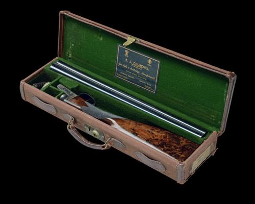 22in. nitro reproved barrels, matt Churchill rib gold-inlaid '22' at the breech end, the tubes engraved 'E.J. CHURCHILL (GUNMAKERS) LTD. ORANGE ST. GUNWORKS. LEICESTER SQUARE. LONDON.', 2 1/2in. chambers, bored approx. 1/4 and 3/4 choke, treble-grip action with hidden third bite, slim fences, automatic safety with gold-inlaid 'SAFE' detail, floral bouquet and acanthus scroll engraving, the makers name in scrolling banners, the underside engraved and gold-inlaid in a cartouche 'UTILITY "22" MODEL', retaining much colour-hardening and finish, 15 1/2in. burr walnut stock (likely replacement), weight 6lb. 4oz., in its canvas and leather case with gold-tooled trade label
