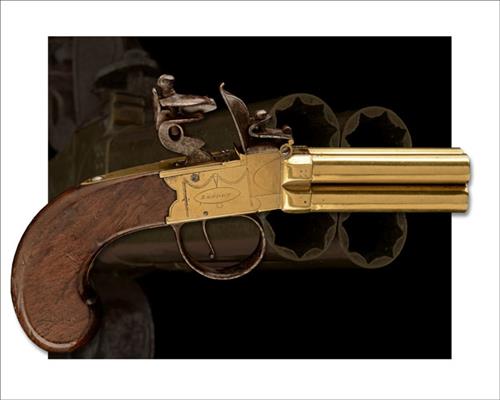 T. KETLAND, LONDON A RARE 60-BORE FLINTLOCK FOUR-BARRELLED ALL-BRASS VOLLEY-PISTOL, no visible serial number,