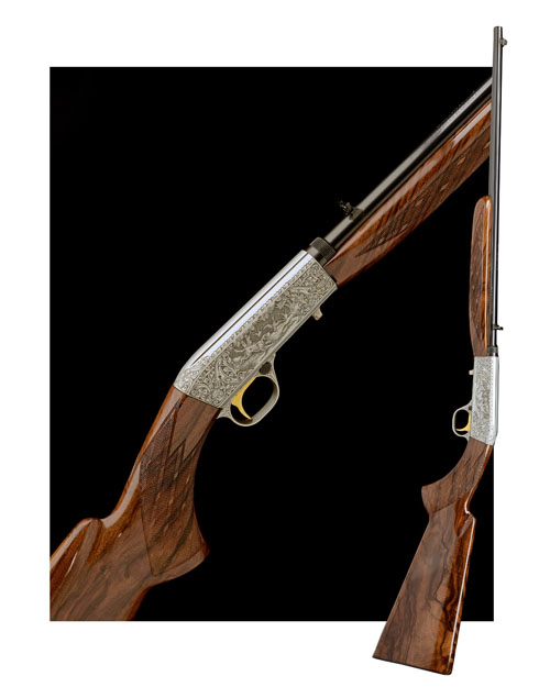 19 3/8in. nitro barrel with folding adjustable open sights and bead fore-sight, gold-washed trigger, action finely relief engraved with woodland scenes of hound and fowl amid stylised acanthus on a matted background, satin finish, 14 1/8in. highly-figured pistolgrip stock, weight 5lb. 1oz.