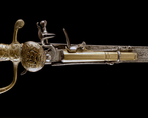 German, late 18th century, with 22 1/4in. cut-down blade with indistinct etching at the ricasso, pistol mounted to the right side of the blade, with 4 1/4in. two-stage brass barrel, cast and chased brass hilt with half shell guard, 'D' shaped knuckle-bow, natural staghorn grip (wear and pitting throughout, no scabbard).