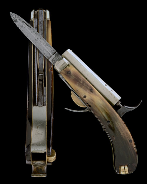 circa 1860, with solid nickel Birmingham proved 3 1/2in. smooth-bore barrel, central hammer with brass-bolstered concealed trigger, large single-edged 3 1/2in. stiletto blade signed 'UNWIN & RODGERS, SHEFFIELD', smaller drop-point 2 1/4in. blade signed 'NON XLL UNWIN & RODGERS PATENT', smooth horn side-scales (small amount of worm damage), lidded box for caps or balls to the rear and side mounted concealed brass ball-mould and iron tweezers