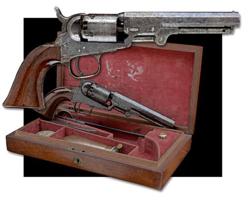 for 1855, with blued octagonal 5in. barrel, the top-flat signed 'ADDRESS COL. COLT LONDON', plain cylinder with roll engraved scene, open iron frame, iron grip-straps and trigger-guard (traces of silver plating), smooth walnut one-piece grip and under-barrel rammer, strong traces of finish throughout; TOGETHER WITH its makers fitted storage case compartmented and lined in red velvet (label removed), and containing a number of original accessories including a tin of Eley caps, an iron bullet mould, an 'L' shaped nipple-key, wire cleaning rod and a Dixon powder flask