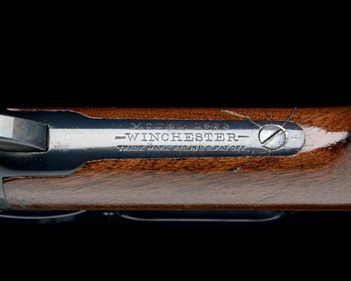 for 1912, with blued 22in. barrel, small ramp fore-sight, elevating ladder rear-sight, blued receiver signed by the maker and marked with patent dates to August 1907, saddle ring fitted to left hand side, top-tang marked 'MODEL 1895 WINCHESTER TRADE MARK REG. IN U.S. PAT. OFF.', walnut butt-stock with chequered iron 'shotgun' heel-plate, split finger-lever, integral box magazine and walnut half fore-end with broad finger-groove down each side, iron barrel-band and walnut top-cover surrounding the rear-sight, the whole retaining much original finish throughout