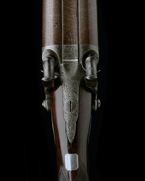 circa 1845, with re-browned twist iron 31 1/4in. octagonal single multi-groove rifle barrel, the top-flat signed 'W. & J. KAVANAGH 12 DANE STREET DUBLIN' (refreshed), silver blade fore-sight, dove-tailed standing notch rear-sight, shaped full-width scroll engraved breech-block with two nipples and a further raised border and scroll engraved panel to the centre, the right hand side with moulded side buttress drilled with the ignition flue, both sides with moulded walnut fore-end fillets, the 12-bore barrels of conventional form, twist-iron and 29 3/4in. in length, the top-rib signed in a similar manner, border and acanthus scroll engraved top-tang, border, acanthus scroll and gamescene engraved bar action locks with dipped tails and signed 'KAVANAGH' forwards of the scroll engraved dolphin headed hammers, figured walnut half-stock chequered at the wrist, engraved iron furniture, silver escutcheons to wrist and barrel key and brass mounted mahogany ramrods with both sets of barrels; COMPLETE WITH its manufacturers brass cornered stained oak storage case, compartmented and lined with green baize for the gun with both sets of barrels and including a number of period accessories probably original to the gun