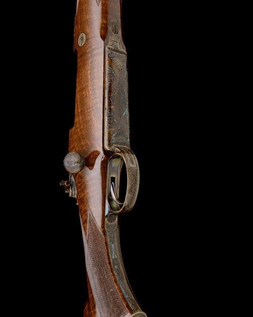 23 3/4in. nitro barrel gold-inlaid 'JOH. OUTSCHAR'S SOHN . FERLACH' and with thin gold line detail at the knoxform, finely matted sight rib gold-inlaid 'CAL .416 RIGBY' with open sights and two folding leaf sights, gold-inlaid sight lines and marked for 50, 100 and 200 yards, finely matted ramp-mounted gold bead fore-sight with gold line detailing and fold-over moonsight, receiver finely engraved with acanthus scrollwork, square bridges with chequered top flats and gold line bordering, bolt handle with gold line detail and progressive radial cut chequering, florally engraved recoil blocks with gold radius, hinged straddle floorplate with push button release, fine acanthus scroll engraving, retaining virtually full original colour-hardened finish overall, highly-figured pistolgrip stock with cheekpiece, engraved and colour-hardened sling eyes, engraved and colour-hardened steel pistolgrip-cap, darkwood finial, 15in. pull including 5/8in. leather covered recoil pad