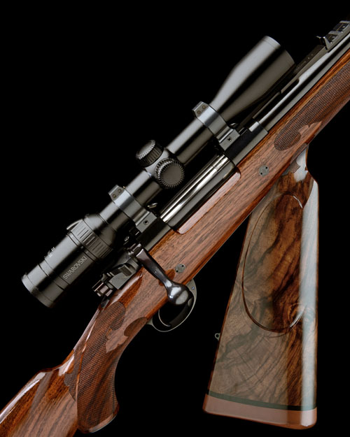 25 1/2in. nitro barrel, sight rib engraved 'J.P. SMITHSON GUNMAKER', open sights and two folding leaf sights with gold-inlaid sight lines and marked 100, 200 and 300, ramp-mounted bead fore-sight, receiver mounted with a Swarovski Z3 3-9x36 telescopic sight in quickly-detachable mounts, engraved recoil blocks, hinged floorplate with push button release, blacked finish, highly-figured pistolgrip stock with cheekpiece, fleur de lys chequering, sling eyes, pistolgrip-cap, darkwood finial, 14in. pull including 1in. rubber recoil pad