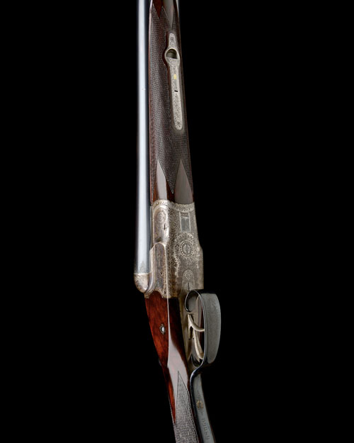 27in. Greener trade mark steel barrels with acanthus scroll detailing at the breech ends, matt rib gold-inlaid '2' and engraved 'W.W. GREENER. MAKER. 40. PALL MALL. LONDON. S.W. WORKS ST. MARY'S SQUARE. BIRMINGHAM.', 2 3/4in. chambers, bored approx. 1/4 and 3/4 choke, scoop-back treble-grip action with ropework engraved side shoulders, toplever gold-inlaid '2', manual side safety with gold-inlaid 'SAFE' detail, rolled-edge triggerguard, fine acanthus scroll engraving, retaining much original colour-hardening, 14 3/8in. well-figured 'rational' semi-pistolgrip stock including buttplate, fore-end with Deeley & Edge patent release catch (gold-inlaid '2') and horn finial, weight 6lb. 14oz., in a pigskin leather double-ended motor case with provision for cleaning equipment, together with an extra straight hand stock with diamond grip