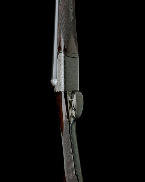 28in. nitro reproved barrels (in 2015) raised matt sight rib engraved 'SUPER MAGNUM EXPLORA' and with finely dished folding leaf sights for 100, 150, 200, 250 and 300 yards with silver-inlaid sight lines and gold-inlaid distance designations, bead foresight, sunken rib, tubes engraved 'WESTLEY RICHARDS 178 NEW BOND ST. LONDON. GUN MAKERS BY APPOINTMENT TO HIS MAJESTY GEORGE V HEX ET IMP' (likely refreshed).', 2 3/4in. chambers, rifled chokes, treble-grip scroll-back action incorporating J. Deeley and L.B. Taylor patent hand-detachable locks, patent no. 17731 of 28th July 1897, use number 1957, locks with engine turned finish, Westley Richards patent toplever engraved 'PATENT ONE TRIGGER', automatic safety with gold-inlaid 'SAFE' detail, hinged floorplate, L.B. Taylor patent selective single trigger, patent no. 26659 of November 17th 19099, use number 32, with triggerplate mounted selector switch with gold-inlaid 'L' and 'R' details, fine bold acanthus scroll engraving, the triggerguard with a setter, brushed bright and reblued finish overall, 14in. well-figured stock (small crack at hand) including 3/4in. rubber recoil pad, fore-end with engraved Deeley & Edge patent release catch and horn finial, weight 7lb. 14oz.