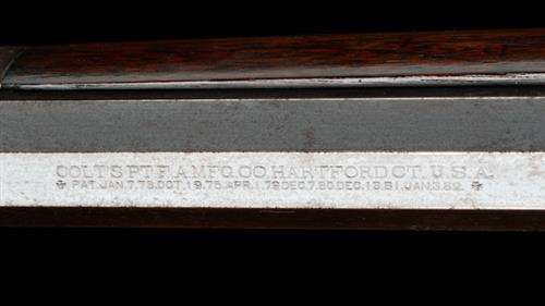 manufactured between 1883 and 1885, with blued octagonal 25 1/2in. barrel, nickel blade fore-sight, buckhorn rear-sight, the top-flat signed 'COLT'S PT FA MFG CO. HARTFORD CT. USA' with patent dates beneath to 1882, stepped flat-sided receiver with rounded top and ejection port (traces of colour), external hammer, top-tang with provision for aperture sight, walnut butt-stock with crescent heel-plate fitted with a central sliding trap-door, blued finger-lever marked 'BURGESS PATENTS', walnut fore-end with colour-hardened nose-cap and full-length under-barrel magazine tube, the whole retaining a strong amount of finish