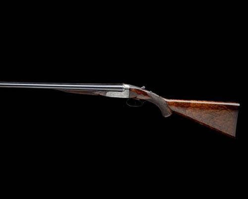 28in. sleeved nitro barrels (originally a .360 Rook rifle) with Holland address inscribed on new rib (spurious), 2 1/2in. chambers, bored approx. 1/4 and 3/4 choke, treble-grip action with Anson & Deeley patent use number 1048, automatic safety, fine scroll engraving with floral bouquets, brushed bright and reblued finish overall, 14 1/2in. well-figured pistolgrip stock (insert at the hand from removed peepsight mount), with pistolgrip-cap and buttplate, bolstered fore-end wood, weight 5lb.