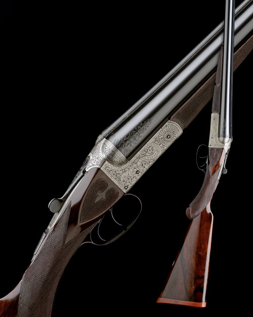 30in. nitro reproved barrels with bold acanthus detailing at the breech ends, rib engraved 'LYON & LYON. LONDON & CALCUTTA', 2 3/4in. chambers, bored approx. 1/4 and 3/4 choke, treble-grip action, the standing breech inlaid in white metal 'EJECTOR', automatic safety with white metal inlaid 'SAFE' detail, fully engraved with bold scrolling acanthus on a matt background, crosshatch, feather and vine bordering, sunburst fences, the left and right sides with lone hounds, brushed bright and reblued finish overall, 14 3/4in. figured semi-pistolgrip stock with ornate chequering borders, the head with chequered heart and fleur de lys panels, with a 5/8in. rubber recoil pad, the fore-end chequered en suite, weight 6lb. 7oz., in a lightweight leather case with Lyon & Lyon trade label