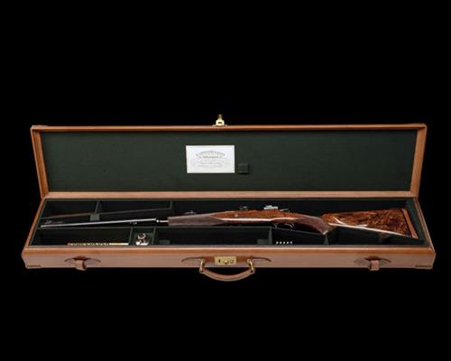 22 3/4in. nitro Pac nor barrel engraved 'B. LAUBSCHER & ASSOC. CAPE TOWN', block-mounted open sights with folding leaf sight, gold-inlaid sight lines and marked for 100 and 200 yards, ramp-mounted bead fore-sight with folding protector, the receiver (with thumb cutout) (Holland & Holland style) side mounted with a quickly-detachable telescopic sight rail, the rings engraved with the calibre designation and serial number, matt top receiver ring, hinged floorplate engraved '4 CARTRIDGES' with push button release, highly-figured pistolgrip stock with cheekpiece, steel pistolgrip-cap, sling swivels, 14 1/2in. pull including 7/8in. rubber recoil pad, in its full length leather case with some accessories