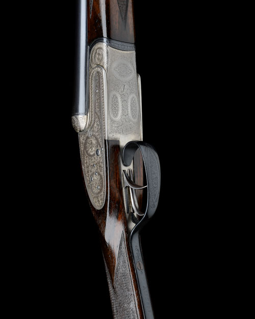 28in. nitro chopperlump barrels, 2 3/4in. chambers, bored approx. imp. cyl. and 1/2 choke, action face with patent gas checks, automatic safety, acanthus scroll engraving with floral bouquets, bright and blued finish overall, 14 1/2in. stock including 7/8in. ebonite extension, weight 6lb. 4oz., in a universal case