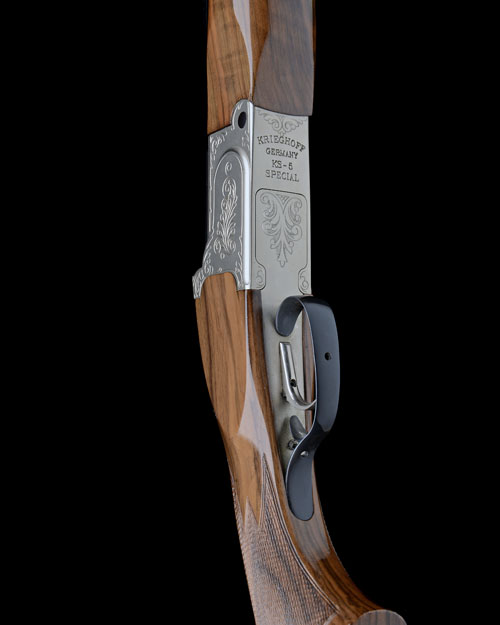 34 1/4in. (87cm) free floating nitro barrel with quickly-adjustable ventilated tapered stepped matt top-rib with intermediate bead sight, 2 3/4in. chamber, multichoke (no spares), hold-open toplever, adjustable triggerpull, scroll engraving, the underside with 'KRIEGHOFF GERMANY KS-5 SPECIAL', satin finish, 14 3/4in. well-figured pistolgrip stock with palm swell, adjustable comb and including 1in. ventilated rubber recoil pad, beavertail fore-end, weight 8lb. 11oz.