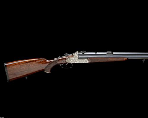 25 1/8in. nitro barrels with raised matt rib, open sights and ramp-mounted bead fore-sight, the breech end with quickly-detachable telescopic sight mount bases with mounts, 2 3/4in. shot chamber, bored approx. 3/4 choke, quadruple-grip action with side-bolsters, removable striker discs, tang-mounted shot / ball selector switch, manual side safety, set front trigger, bold Germanic scroll engraving with oak leaf and acorn designs, surrounding game scenes of roe deer, fox and hare, the underside with a wild boar and signed with with makers details, 14 3/8in. pistolgrip stock with cheekpiece, fish scale chequering, pistolgrip-cap, sling swivels and including 1/2in. rubber recoil pad, weight 7lb. 14oz. (not including mounts)