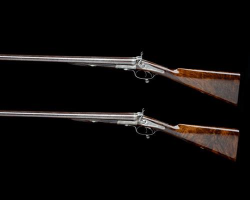 28in. black powder only bold damascus barrels, ribs engraved 'EDWARD PATON & SON. 108 MOUNT ST. GROSVENOR SQr. LONDON. & 44 GEORGE ST. PERTH.', and '1' and '2' at the breech ends, 2 1/2in. chambers, bored approx. true cyl. in all, Jones patent rotary-underlevers, carved percussion fences, non-rebounding back action locks with dolphin hammers, fine border and acanthus scroll engraving, the top tangs with roundels engraved '1' and '2', brushed bright, the triggerguards retaining traces of original finish, 14 1/4in. well-figured stocks, weight 6lb. 3oz., in a brass-cornered oak and leather case with applied Paton Mount Street and George Street addressed trade label