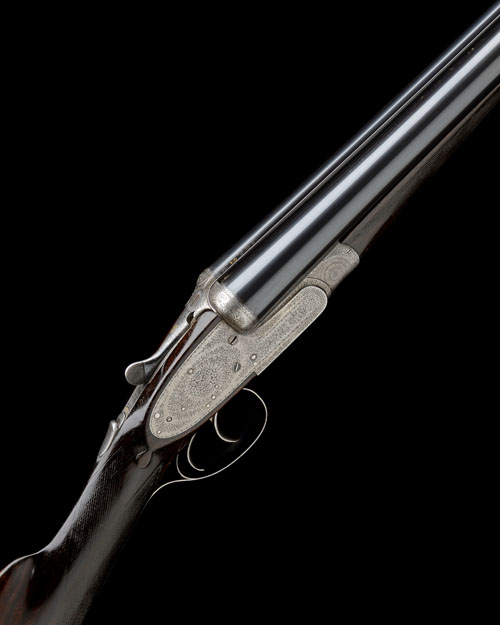 29in. nitro barrels (pitted), the tubes engraved 'CHARLES LANCASTER. 99. MOUNT STREET. BERKELEY SQUARE. LONDON.', and the rib gold-inlaid '2', 2 3/4in. chambers, bored approx. imp. cyl. and 1/4 choke, toplever gold-inlaid '2' (toplever spring broken), slender W. Baker patent assisted-opening action, patent no. 16778 of 22nd March 1913, with Baker patent ejectors, automatic safety with gold-inlaid 'SAFE' detail, removable striker discs, bouquet and scroll engraving, the underside gold-inlaid 'CHARLES LANCASTER. LONDON.', brushed finish, 14 1/2in. figured stock including 1 1/2in. wooden extension, fore-end with gold-washed internals, weight 6lb. 1oz., in an oak-lined leather case
