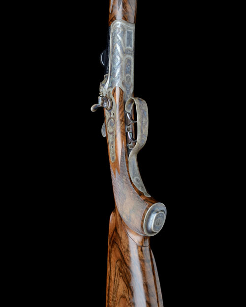 21 5/8in. octagonal nitro barrel, raised rib finely engraved with scrolling acanthus designs, central banner engraved in script 'Herbert Streitmeier - St Paul', open sights engraved to match and with crosshatch front with gold inlaid triangular sighting aid, ramp-mounted bead fore-sight with further scroll designs, the muzzle end with panels of scrollwork and crosshatched muzzle face, the breech end with further scrolls and mounted with a K. Kahles Helia Super 39S2 telescopic sight in scroll engraved quickly-detachable mounts, rounded bar action with carved percussion fence, rebounding back-action lock with high spurred carved hammer, set triggers, the whole engraved with extremely fine scrolling acanthus and floral bouquets, the triggerplate signed 'Deflorian', retaining virtually full original colour-hardened finish, 14 5/8in. highly-figured pistolgrip stock with cheekpiece, colour-hardened steel pistolgrip-cap, sling swivels and including 1/2in. rubber recoil pad, fore-end with Deeley & Edge patent release lever and sculpted horn finial, weight 7lb.