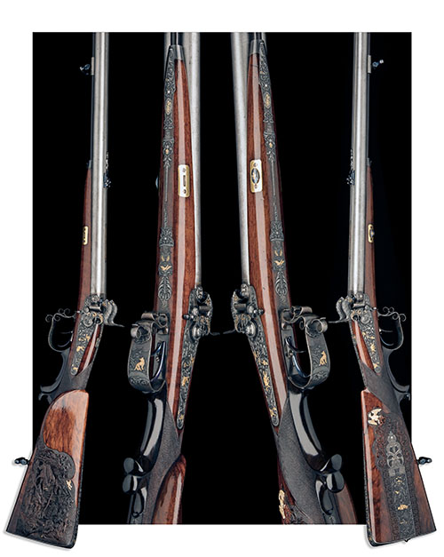 circa 1845-50, with brushed bright fine twist damascus 28in. barrels, the right rifled in seven grooves, the left smooth, the contrasting damascus top-rib with inlaid panel signed in gold 'F. DUNCKEL BURGLINN', blacked niello borders either end of the signature, dove-tailed broad based blued fore-sight with crescent blade, blued rear-sight with numbered register for windage adjustable via a screw and lockable via another, the front of sight base carved as a running snake, colour hardened rib-end with contrasting engraved borders, colour hardened breech-blocks, the snails shaped and moulded and carved in relief as a flower, the central vents in platinum, the undersides with oval makers marks 'MST', blued nipples with polished tops, fully chased and engraved complex top-tang with curled percussion fences to the fore, the relief engraving further enhanced with a gilded eagle between the hammers, a broad panel with a stag in a woodland setting against a gilded background with further gilt accents to the remainder, fully carved and engraved back-action locks with engraved extended underbarrel supports, the engraving featuring relief carved acanthus scrolls inhabited with gilt game animals, birds and flowers, polished exposed pin-heads, fully carved and engraved swinging safes forwards of each hammer, each inlaid with a gold line, relief carved, pierced and engraved hammers with engraved dome-headed screws, the back curves pierced with bows and arrows, the bodies inhabited by gilded mythical beasts, the hammer heads carved as dragons with gilt eyes, teeth and realistically carved hair, finely chequered hammer spurs, figured walnut straight-hand half-stock finely chequered at the wrist, the right hand side relief carved with a panel of acanthus scrolls and a border of oak-leaves surrounding a complex pierced patch-box and hinge, the front of the panel with applied eagle in bone clutching a fawn in its talons, the lid of the leather-lined patchbox relief carved with a gilt hunter stalking a gilded mouflon in a mountainous setting with small detail also picked out in gilt, the left hand side of butt with moulded and raised cheek-piece, the rear deeply relief carved with a scene of hunting dogs attacking wild boar in a woodland setting whilst a hunter stands by with his hanger waiting to administer the 'coup de grace', the trees inhabited by an applied gamebird in bone, iron heel-plate, the long top-spur carved en-suite with the locks, moulded and carved horn lower tang cover with pistol-grip spur, carved and engraved complex trigger-guard bow featuring a gilded fox and a multiple curled scroll leading edge, blued set trigger for the right hand barrel, plain blued trigger for the shot barrel, long carved, chased and engraved trigger-guard complex finial with gilded detail almost meeting the en-suite complex ramrod throat, rectangular gilt barrel key escutcheons, silver mounted ebony under-barrel ramrod and front and rear blued sling-swivels