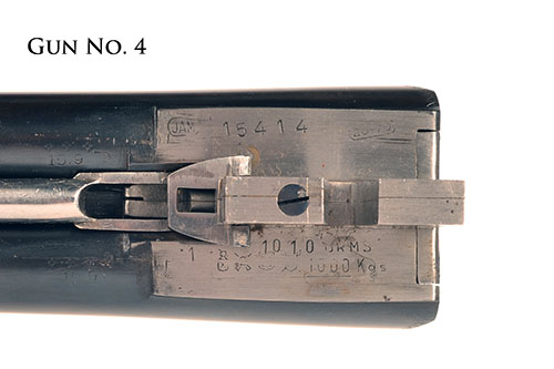 27in. nitro chopperlump barrels, raised matt ribs gold-inlaid '3' and '4', 2 3/4in. chambers, bored approx. imp. cyl. and 1/4 choke, treble-grip actions with hidden third bites, side-clips, removable striker discs, toplevers gold-inlaid '3' and '4', automatic safeties, hand-detachable lockplates, gold-inlaid cocking-indicators, Holland & Holland style self-opening systems, articulated front triggers, rolled-edge triggerguards, bold stylised floral and scroll engraving with pheasant and duck, the triggerguards gold-inlaid with an 'F.M.' monogram, bright and blued finish overall, 14 3/4in. stocks, weight 5lb. 13oz.