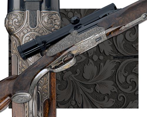 24 7/8in. nitro barrels with raised matt sight rib, open sights and ramp-mounted blade fore-sight, the breech end mounted with a Zeiss Diavari ZM 1,25-4x42 T* telescopic sight, serial no. 2031347, in quickly-detachable mounts, 2 3/4in. shot chamber, bored approx. 1/2 choke, treble-grip action with side bolsters, sprung manual safety / cocking slide, shot / ball selector switch, cocking-indicators, set front trigger, the whole carved in relief with stylised scrolling acanthus interspersed with floral motifs and mythical beasts, all on a finely matted background, the triggerguard gold-inlaid with a monogram 'HF', the triggerplate signed 'Gerd Rausch', bright finish, 14 3/8in. highly-figured pistolgrip stock with palm swell, sculpted cheekpiece and hogsback comb, steel pistolgrip-cap carved in high relief with a mouflon, sling eyes, 5/8in. rubber recoil pad, schnabel fore-end with Deeley & Edge patent release, weight 9lb. 3oz. (unscoped) and 10lb. 11oz. (with scope), in a full length leather universal case