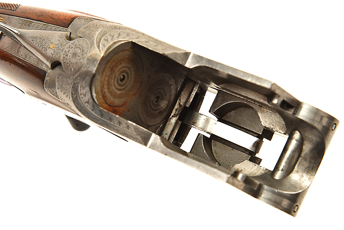 for 1976, 27 5/8in. nitro barrels with 5mm ventilated matt top-ribs gold-inlaid '1' and '2' at the breech ends, 2 3/4in. chambers, bored approx. 1/4 and 1/2 choke, fractures to two-piece extractors, hold-open toplevers gold-inlaid '1' and '2', automatic safeties with integral barrel selector switches and gold-inlaid 'O', 'U' and 'S' details, fine acanthus scroll engraving surrounding game scenes of hound and fowl, No.1 signed 'J. PIROTTE', No.2 signed 'M. BODSON', 14 5/8in. well-figured roachbelly stocks including 5/8in. recoil pads, minor grain splits at hand No.1, weight 6lb. 14oz., in a leather motor case with canvas and leather outer
