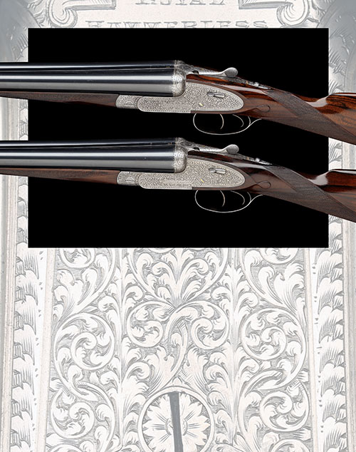 29in. nitro barrels, ribs gold-inlaid '1' and '2', tubes engraved 'HOLLAND & HOLLAND. 98, NEW BOND STREET. LONDON.', 2 1/2in. chambers, bored approx. true cyl. and 1/2 choke, minor dents and repairs, toplevers gold-inlaid '1' and '2', action faces with gas checks, automatic safeties with gold-inlaid 'SAFE' details, hand-detachable lockplates, gold-inlaid cocking-indicators, rolled-edge triggerguards, carved shell fences, best bold scroll engraving with floral bouquets, the undersides with elaborate cartouches engraved 'ROYAL HAMMERLESS EJECTOR', brushed finishes, 15 1/4in. highly-figured replacement stocks, matching fore-end woods, weight 7lb. (No.1) and 7lb. 2oz. (No.2), in their brass-cornered oak and leather case with internal protector flap