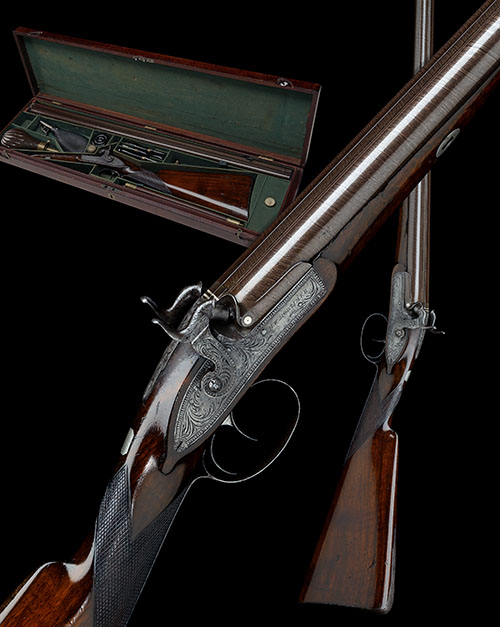 circa 1835, with expertly re-browned 32in. twist iron barrels, the top-rib signed 'H. W. MORTIMER, LONDON' with engraving to rib at breech end together with twin platinum lines, carved fences forward of the nipples, fully borderline and scroll engraved top-tang, border and scroll engraved bar-action locks signed 'H. W. MORTIMER, slab-sided en-suite hammers, walnut half-stock chequered at the wrist, clipped corner rectangular silver vacant escutcheon behind the top-tang, iron heel-plate with engraved top-spur, engraved lower tang and trigger-guard bow, pineapple finial and under-barrel ram-rod; TOGETHER WITH a walnut storage case almost certainly original to this gun, the interior compartmented and lined in green baize (some restoration) and complete with a full complement of accessories including a powder and shot flask, two turn-screws and a nipple key, adjustable measure, patch pot, nipple pot and a later three piece cleaning rod