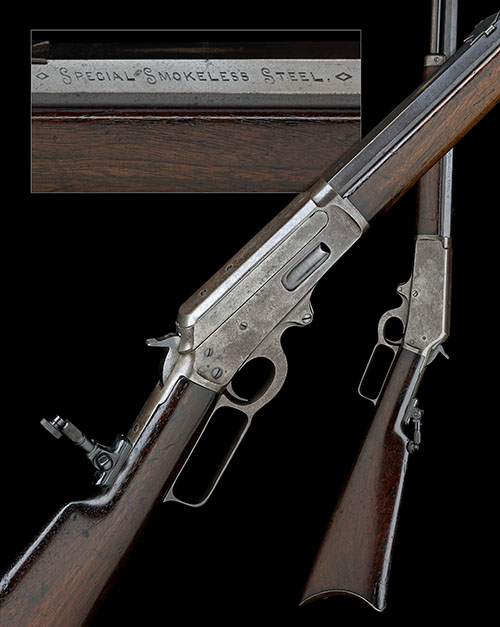 first quarter of the 20th century, with octagonal 26in. barrel, the top-flat signed with the maker's address and patent dates to 1893, the left hand side flat marked 'SPECIAL SMOKELESS STEEL', dovetailed nickel fore-sight blade, additional clip-on tunnel protector, rear-sight broken off and re-profiled into a dove-tail filler, slab-sided receiver, the top marked 'MARLIN SAFETY', adjustable peep-sight to the wrist, walnut butt-stock with iron crescent heel-plate, iron finger-lever, plain walnut fore-end and full-length magazine tube, traces of finish