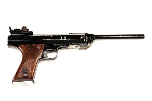 A .22 BREAK-BARREL AIR-PISTOL, UNSIGNED, MODEL 'RO72', serial no. 020775. TOGETHER WITH A .177 'RO71' MODEL, serial no. 042230, the first with 7 1/2in. barrel, adjustable sights and brown plastic grips, collectors condition, the second with losses to finish and sights (2)