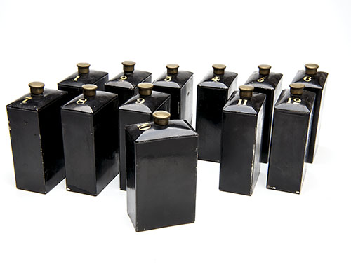 circa 1850, comprising of a black japanned tin measuring 11 1/2in. long by 7 1/2in. deep by 8in. wide, the hinged lid printed with 'IMPROVED RIFLE POWDER', the folding clasp closure with provision to padlock (missing), two folding heavy wire handles, the interior with secondary leather banded and lined inner lid, the underside with the majority of a circular gummed 'KAMES GUNPOWDER WORKS' printed label, the interior compartmented for twelve identical black japanned tins numbered in gilt from '1' to '12', each compartment leather lined and each tin with applied leather base (no contents to tins)