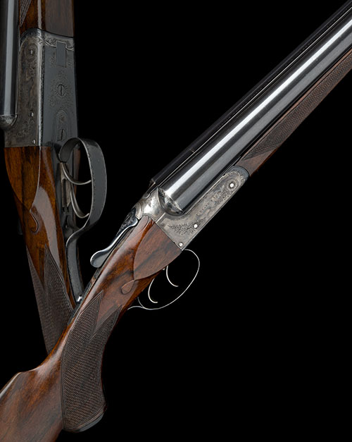28in. nitro barrels (likely replacements, circa 1977), rib engraved 'THOMAS BLAND & SONS. GUNMAKERS LTD. 4 & 5 WILLIAM IV STREET. STRAND. LONDON.', 2 3/4in. chambers, bored approx. 1/2 and 3/4 choke, treble-grip action with Westley Richards style toplever, automatic safety with engraved 'SAFE' plaque, action flats marked 'TRADE MARK B', 'T.B & S', and 'ANSON & DEELEY'S PATENT 8942', border engraving with some acanthus scrolls, retaining traces of colour-hardening, 15in. boldly-figured (likely replacement) pistolgrip stock with horn pistolgrip-cap, fore-end with Deeley & Edge patent release catch, horn finial and replacement wood, weight 6lb.