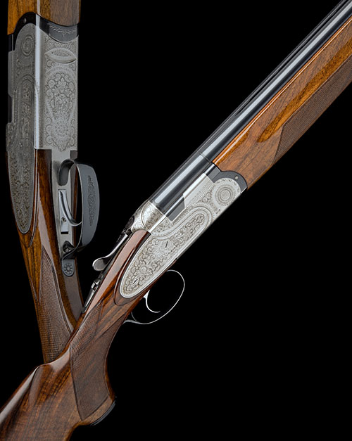 28in. nitro barrels with 7mm ventilated matt top-rib, 2 3/4in. chambers, bored approx. 1/4 and 1/2 choke, hold-open toplever, automatic safety with integral barrel selector switch, action and decorative sideplates with floral and acanthus leaf engraving, bright and blued finish overall, 13 7/8in. pistolgrip stock with Beretta logo pistolgrip-cap and including 5/8in. rubber recoil pad, fore-end wood with repaired cracks, weight 7lb. 5oz., in its Beretta universal case