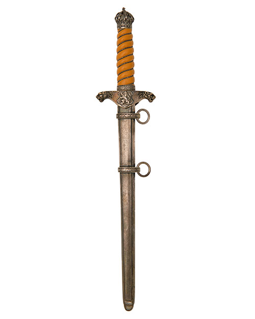 circa 1935, with tapering double-edged 9 1/2in. blade etched with arabesques and a cyrillic inscription (cleaned, some dark staining), silver plated cross-guard embossed with the Bulgarian Lion within a shield to the front, a Maltese style cross badge with crossed swords to the reverse, both quillions carved in the form of lion's heads, spiral wire-bound mustard coloured celluloid grip with pierced crown pommel and oakleaf carved ferrule, complete with its plated pebbled finish scabbard with twin suspension rings