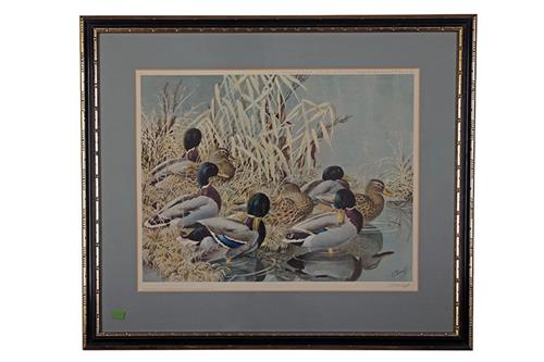 A COLLECTION OF FOUR LIMITED EDITION G.F. TUNNICLIFFE PRINTS, non match edition numbers, showing prints of mallard ducks, pintail ducks and sea birds, glazed and set in a gilt from, measuring approx. 29in. x 26in.