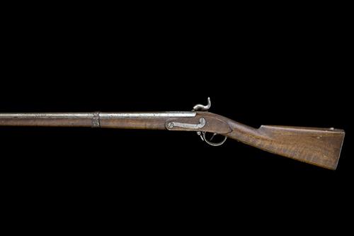 probably Belgian or Swiss and converted from flint circa 1840, with plain iron 40 1/2in. barrel, boat-shaped fore-sight applied to the nose-cap band, no provision for rear-sight, the serial number beneath the roman numeral 'III' at breech, plain military style lock retaining fenced pan cut-out and plugged holes, sculpted hammer, walnut full-stock with iron furniture, no finger ribs to lower tang, two barrel-bands and double banded nose-cap, iron ramrod with conical tip, the whole with patchy staining to exposed iron surfaces and complete with an iron socket bayonet for the same model in similar condition (no scabbard)