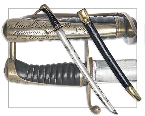 first quarter of the 19th century, with slightly curved broad fullered 8in. spearpoint blade (some light staining), false edged for the last 8in. boat-shaped brass straight cross-guard with single ball quillion and integral wire 'P' shaped knucklebow, brass backstrap engraved 'MARSHALL'S OFFICE, MANSION HOUSE, LONDON No.23' with integral brass capped pommel, ribbed horn grip and complete with its black leather scabbard with brass mounts (seam split)