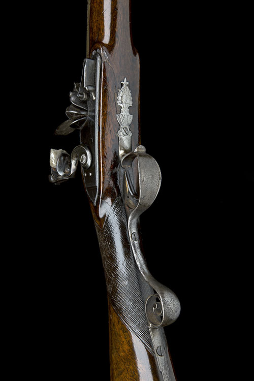circa 1795, with two stage 28in. Spanish barrel banded and engraved at the intersection with traces of gilt inlay, bead fore-sight, gilded Spanish makers cartouches and fleur-de-lys quality marks at breech, slightly curved, flat, bevel-edged stepped tail lockplate signed forwards of the hammer in script 'H.W. MORTIMER & CO', gilded rainproof pan, roller frizzen, walnut half-stock chequered at the wrist (crack below the lock), raised cheek-piece, iron furniture including scrolled pistol-grip lower tang, vase finial, horn fore-end tip and replacement ramrod
