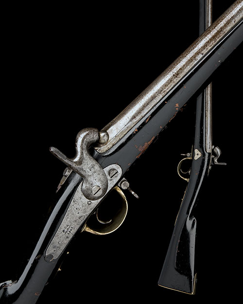 Tula Arsenal dated for 1849, with 42 1/2in. barrel, applied brass crescent fore-sight, applied rear-sight to the solid top-tang, heavy Russian arsenal signed back-action lock, walnut three-quarter stock retaining much of its original 'ebonised' black finish, dated brass furniture, the heel-plate stamped with the serial number, two barrel-bands (nose-cap missing), provision for ramrod (also missing)