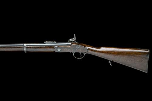 dated for 1863, with round blued 33in. barrel, block and blade fore-sight, elevating ladder rear-sight graduated to 400yds. on the ramp and with the slider engraved 'H.C.', top of breech marked 'WHITWORTH PATENT', plain lock signed 'ENFIELD' with date and a crown over 'V.R.' device at tail, walnut full-stock drilled and plugged at wrist for a later tang-sight (absent), the right side of butt stamped 'ROB'T HUGHES UNIVERSAL FIREARM WORKS BIRM.M.', iron furniture including three barrel-bands and nose-cap, no provision for bayonet, brass tipped jag-ended iron ramrod.