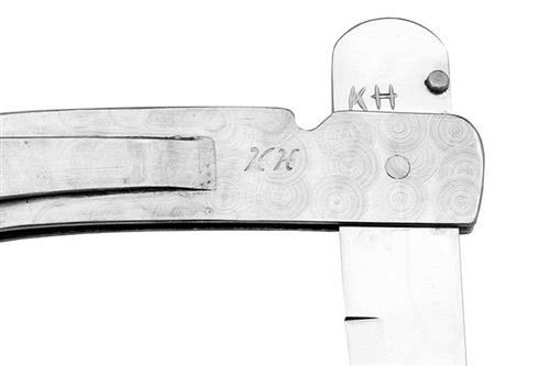 recent, 5in. closed and 7in. open, of curved smooth barrel form with unmarked silver caps, one with blade aperture, the other with release catch, the polished blade and the engine-turned inner mount signed 'KH', the pommel of nickel-silver and the central portion of curly masur birch