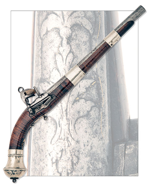 Southern Russia or Corsican circa 1790, with 12 1/2in. iron barrel, semi octagonal form breech-section with arabesque engraving (rubbed), plain miquelet lock with small ring top to the hammer, solid top-tang with integral back-strap, figured walnut three-quarter stock, substantial domed white-metal pistol-grip cap with central iron rosette and lanyard swivel, bone escutcheons to the back-strap and side nails, further bone escutcheon to the guardless ball trigger and two broad plain white-metal barrel-bands, no provision for ramrod