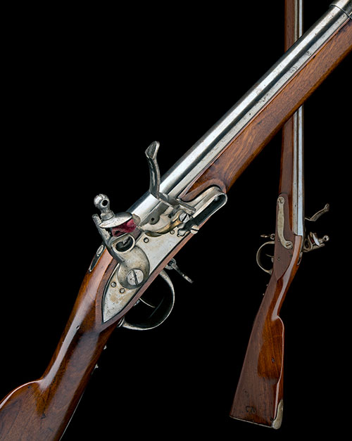 circa 1800 and probably Swiss, with brushed bright (as issued) round iron 42 1/2in. smoothbore barrel, solid top-tang, flat, slightly curved lock with radiused tail and brass pan, walnut full-stock with heavy iron furniture, dished cheek-piece, the right side of the butt marked with roman numerals 'IXII', the left with 'CN', two iron barrel bands and further twin-banded nose-cap, iron under-barrel ramrod and iron swivels