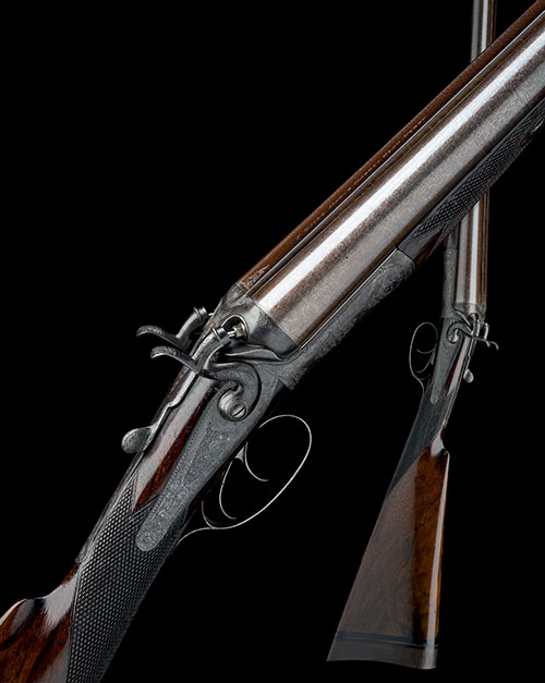 28 1/2in. nitro reproved damascus barrels (shortened), broad rib engraved 'F. GATES. MAKER. MARKET HEAD. DERBY.', 89mm chambers, bored approx. imp. cyl. and 1/4 choke, action incorporating H. Walker's patent No. 445 of 1872, use No. 1024, carved percussion fences, rebounding back-action locks, beaded border and acanthus scroll engraving, 15in. stock including 1 1/4in. rubber recoil pad, repair at fore-end finial, weight 8lb. 7oz.