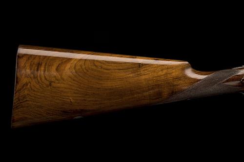 28in. nitro chopperlump barrels, 2 3/4in. chambers, bored approx. 1/4 and 3/4 choke, removable striker discs, automatic safety, gold-inlaid cocking-indicators, articulated front trigger, rolled-edge triggerguard, fine acanthus scroll engraving with floral bouquets, retaining much original colour-hardening and finish, 14 5/8in. figured stock, weight 6lb. 8oz.