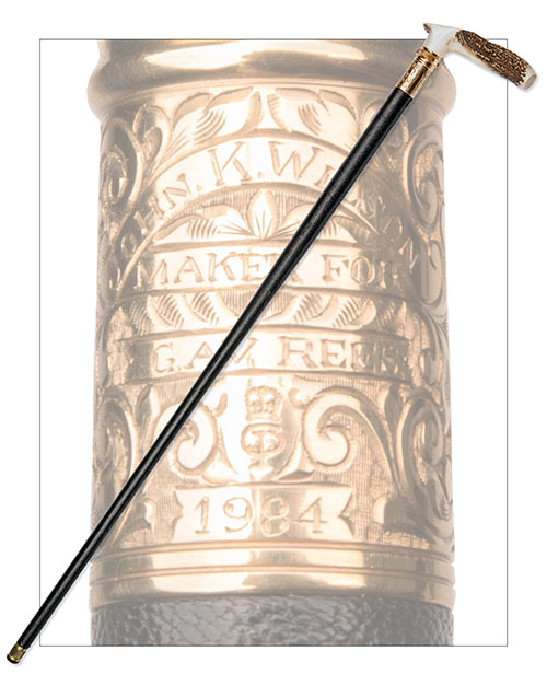 with 26in. barrel including brass and rubber muzzle-plug, twist and pull breech action, the loading tray signed 'J.WILSON MAKER, LONDON', gold-plated scroll engraved concealed trigger mechanism signed 'JOHN K. WILSON, MAKER FOR G.A.V. REES 1984', shaped staghorn handle, the barrel and remainder of handle covered in black, grained leather.