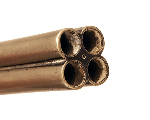 almost certainly from the workshops of John Probin, Birmingham, with detachable 4 1/2in. four-barrel cluster attaching to a two-stage octagonal to sixteen-sided breech, London and Tower private proofs, scroll engraving surrounding a banner on the top-flat signed 'LONDON', moulded band at breech, iron top-tang (cracked and repaired), flat bevel-edged lock with traces of signature below pan, stepped pointed tail, sliding safe behind the replacement cock, bridled frizzen (spring broken), walnut half-stock with paktong furniture including engraved long-spurred butt-cap, carved apron around the top-tang with dot bordered oval escutcheon to wrist, double roll-edged trigger-guard bow with acorn finial and no provision for ramrod