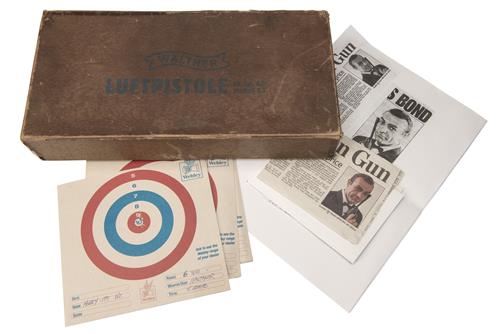 circa 1964, with 9 1/2in. black anodised barrel, ramp fore-sight, adjustable rear-sight, black crackle-finished receiver, blued frame and brown chequered plastic grips, the whole retaining much original finish throughout and complete with its manufacturer's brown card carton, spare sight elements, original cleaning rod and an after-market oil-bottle together with an amateur produced wood case with lid escutcheon engraved with the model details and a newspaper cutting regarding the sale for £277,250 of a similar pistol used by Sean Connery for the promotion of the James Bond film 'From Russia with Love'.