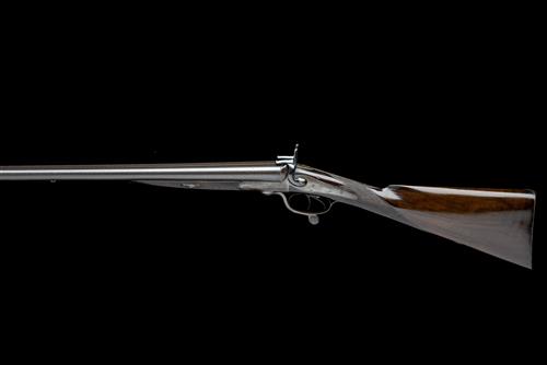 A CASED 12-BORE PINFIRE DOUBLE-BARRELLED SPORTING-GUN, no visible serial number,
