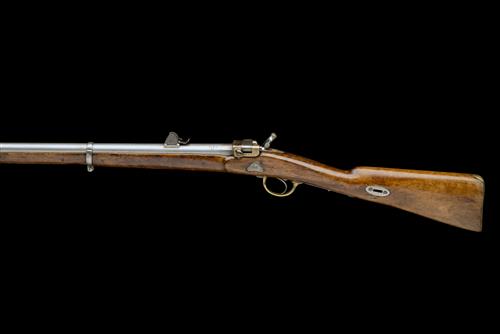 converted from an 1857 Pattern Russian musket, with brushed bright 26in. barrel, block and blade fore-sight, dove-tailed tangent rear-sight with locking wing-nut, bronze breech with flip-open breech-block, plain hump-backed lock and special side-hammer, wood full-stock with brass furniture, two iron barrel-bands and iron ramrod